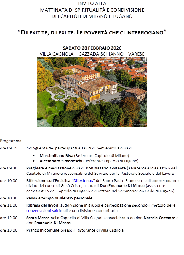 Sabato 28 febbraio a Villa Cagnola di Gazzada Schianno (Va) si svolgerà una mattinata di spiritualità dei Capitoli di Milano e Lugano, promossa da Fondazione Centesimus Annus, che avrà come tema “Dilexit te, Dilexit te. Le povertà che ci interrogano”.