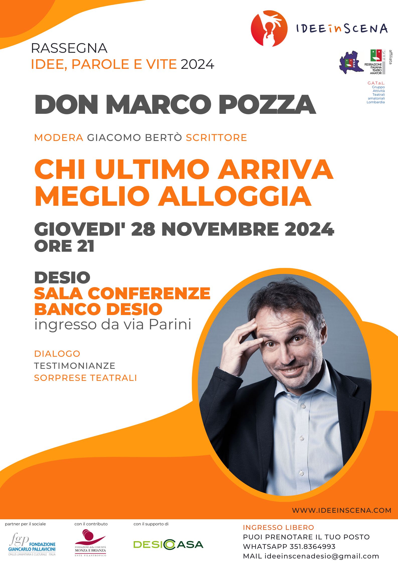 Nella serata di giovedì 28 novembre sarà a Desio Don Marco Pozza, protagonista di un nuovo appuntamento della rassegna “Idee, parole e vite’”, promossa da Ideeinscena. L’appuntamento è per le ore 21 presso la sala conferenze di Banco di Desio e della Brianza (ingresso da via Parini, con ampio parcheggio).