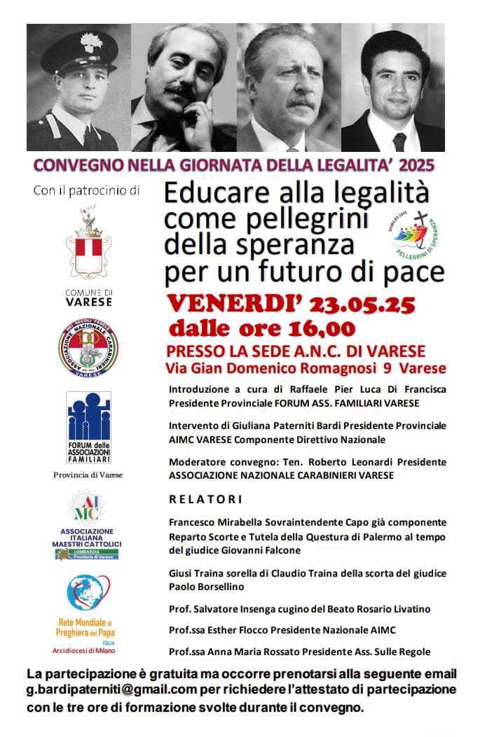 Venerdì 23 maggio, Giornata Nazionale della Legalità 2025, dalle ore 16 alle ore 19 si svolgerà a Varese un Convegno dal titolo “Educare alla legalità come pellegrini della speranza per un futuro di pace”. Questo evento culturale sul tema dell’educazione alla legalità, collegato al Giubileo 2025, avrà come cornice la prestigiosa sede dell’Associazione Nazionale Carabinieri di Varese di Via Gian Domenico Romagnosi 9 (Varese).