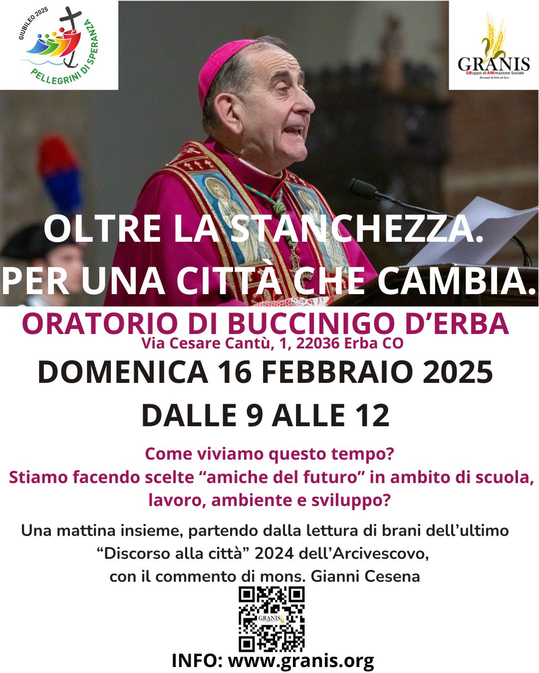 Domenica 16 febbraio, dalle ore 9.00 alle 12.00 presso l’oratorio di Buccinigo d’Erba, il Granis di Erba/Asso (Gruppo di Animazione Sociale dei decanati di Erba ed Asso) propone l’incontro “Oltre la stanchezza: per una città che cambia”