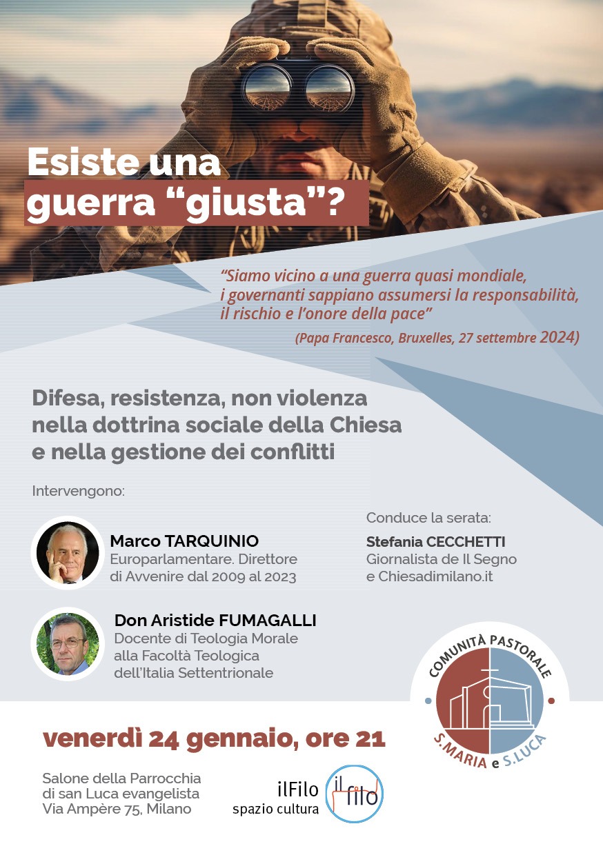 Venerdì 24 gennaio alle 21, presso la parrocchia San Luca Evangelista a Milano, si svolgerà l’incontro/dibattito su «Esiste una guerra giusta?» con Marco Tarquinio e don Aristide Fumagalli. La domanda se ci sia una guerra che può essere definita «giusta» si presenta ripetutamente tra noi da ormai tre anni, esattamente dell’invasione dell’Ucraina.