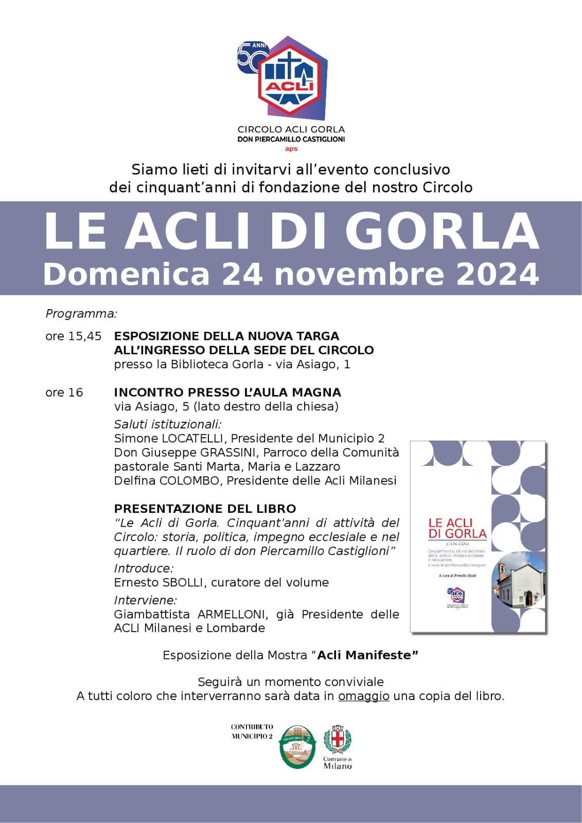 A conclusione dell’anno di festeggiamenti per il cinquantesimo anniversario di fondazione del Circolo Acli di Gorla, domenica 24 novembre con il Patrocinio e un Contributo al Municipio 2, saranno organizzati diversi momenti  celebrativi.