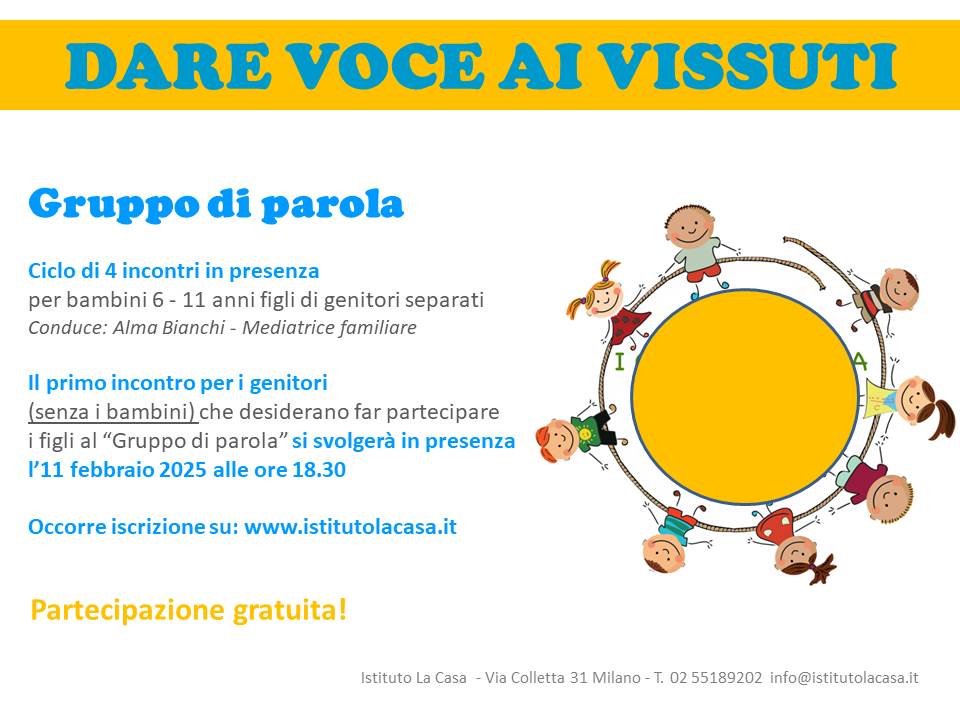 L’incontro per i genitori che desiderano far partecipare i propri figli e figlie al Gruppo di Parola si svolgerà presso la sede dell’Istituto La Casa (via Colletta 31 Milano) martedì 11 febbraio alle ore 18.30.