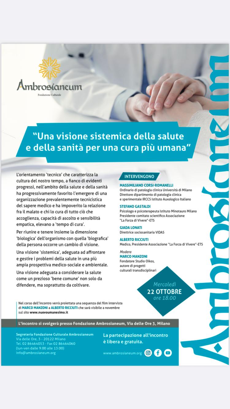 Quale sanità, quale cura sono oggi adeguate a rispondere alle reali esigenze dei cittadini? Fondazione Ambrosianeum proponeper mercoledì 22 ottobre alle 18, un incontro con Massimiliano Corsi-Romanelli, ordinario di patologia clinica presso l’Università di Milano, Stefano Gastaldi, psicologo e psicoterapeuta Istituto Minotauro, Giada Lonati, direttrice sociosanitaria VIDAS, Alberto Ricciuti, medico e presidente associazione La Forza di vivere Ets, e Marco Manzoni, fondatore Studio Oikos.