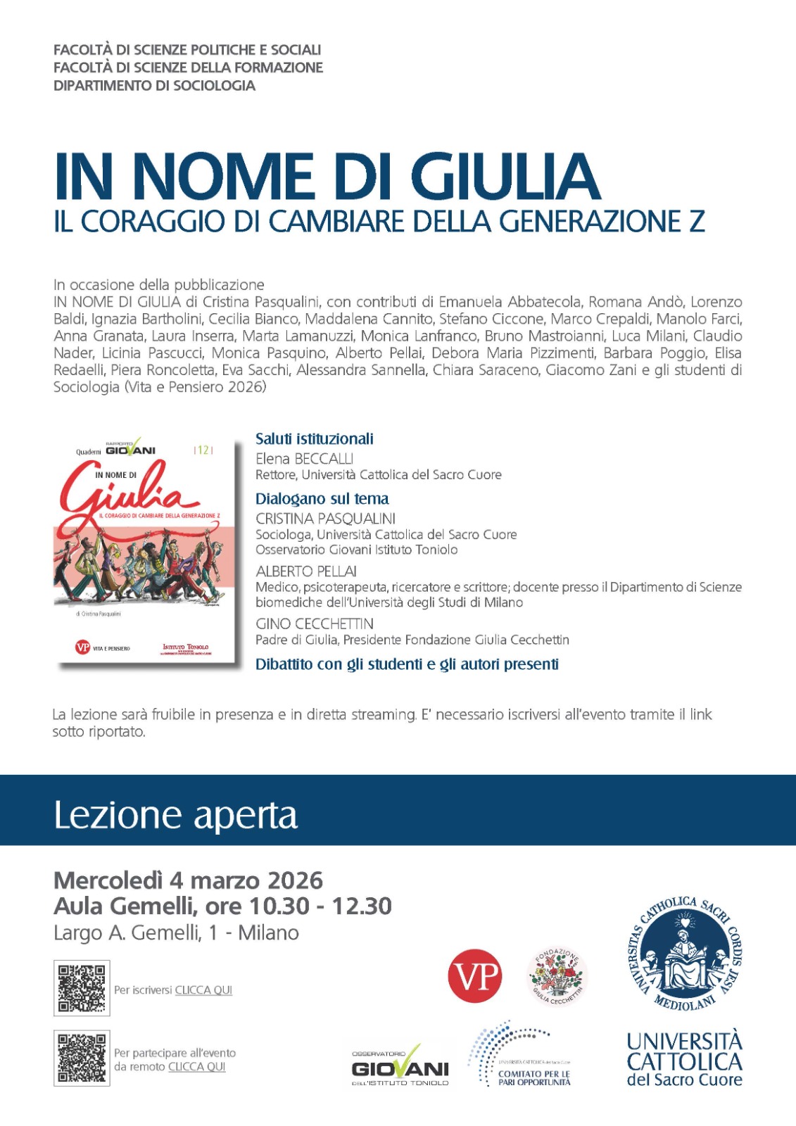 In occasione dell’uscita del Quaderno n. 12 del Rapporto Giovani, dal titolo “In nome di Giulia. Il coraggio di cambiare della Generazione Z” (Vita e Pensiero), di Cristina Pasqualini, si terrà una lezione aperta mercoledì 4 marzo, dalle ore 10.30 alle 12.30, presso l’Aula Gemelli dell’Università Cattolica del Sacro Cuore (Largo A. Gemelli 1, Milano).