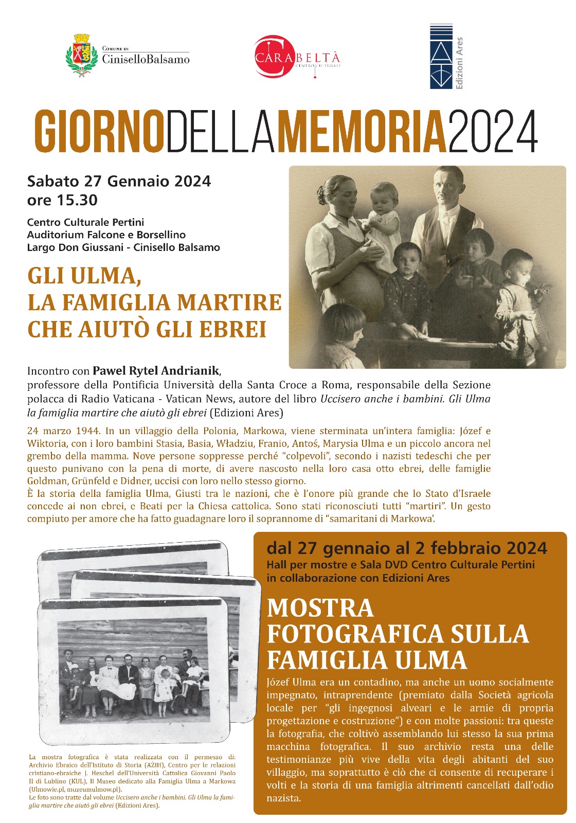 Venerdì 26 e sabato 27 gennaio, per la Giornata della Memoria, su iniziativa di due centri culturali di ispirazione cristiana di Seveso e di Cinisello e in collaborazione con i rispettivi comuni, sarà presentata la nuova edizione, arricchita da un contributo di papa Francesco, del volume che racconta la storia degli Ulma, martiri e beati per la Chiesa e giusti fra le nazioni per gli ebrei (“Uccisero anche i bambini”, edita da Ares)