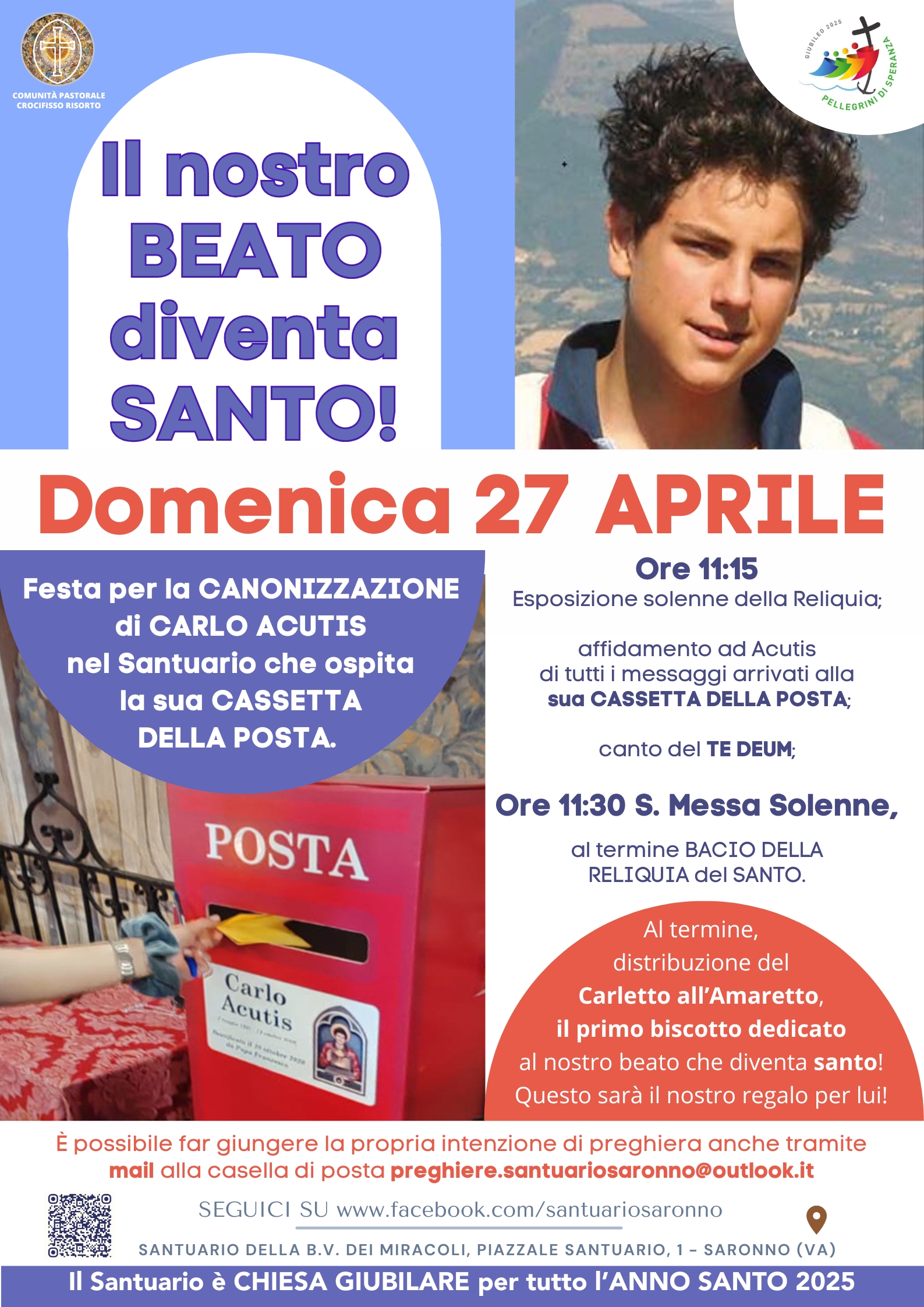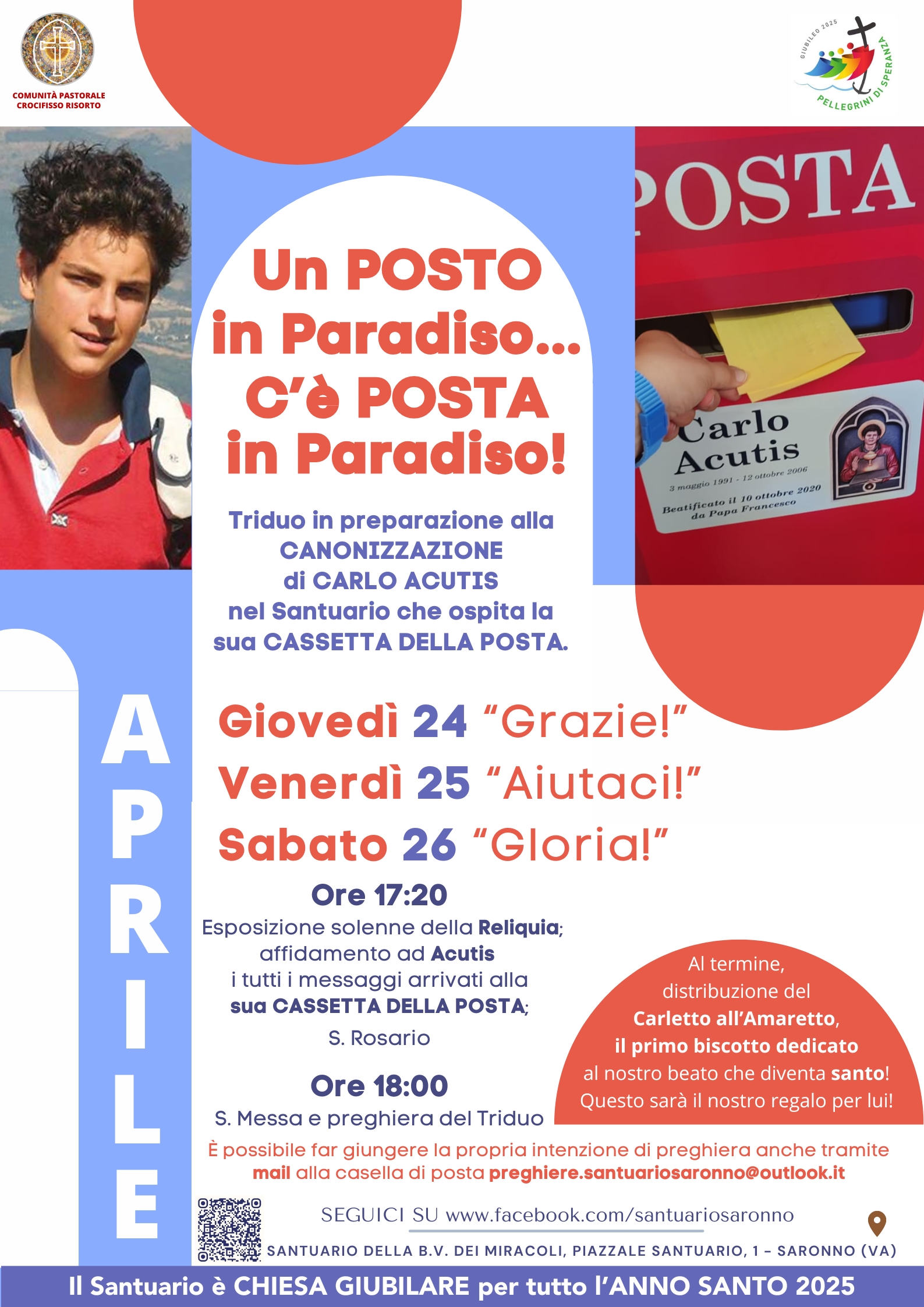 Il Santuario della B.V. dei Miracoli – Chiesa Giubilare – organizza un Triduo (24-25-26 Aprile) di preghiera in onore del beato Carlo, di cui da ormai un anno ospita la sua Cassetta della Posta. I temi di questi tre giorni saranno “Grazie!” (Giovedì 24 Aprile), “Aiutaci!” (Venerdì 25) e “Gloria!” (Sabato 26): ogni giorno alle ore 17.20 esposizione solenne della Reliquia; affidamento ad Acutis di tutti i messaggi arrivati alla sua cassetta della posta; S. Rosario e alle ore 18.00 S. Messa e preghiera del Triduo, a cura di don Massimiliano Bianchi, nominato Missionario della Misericordia da papa Francesco. Al termine, distribuzione del Carletto all’amaretto, il primo biscotto dedicato al giovane beato che diventa santo! È una nuova iniziativa, inventata appositamente per l’occasione.