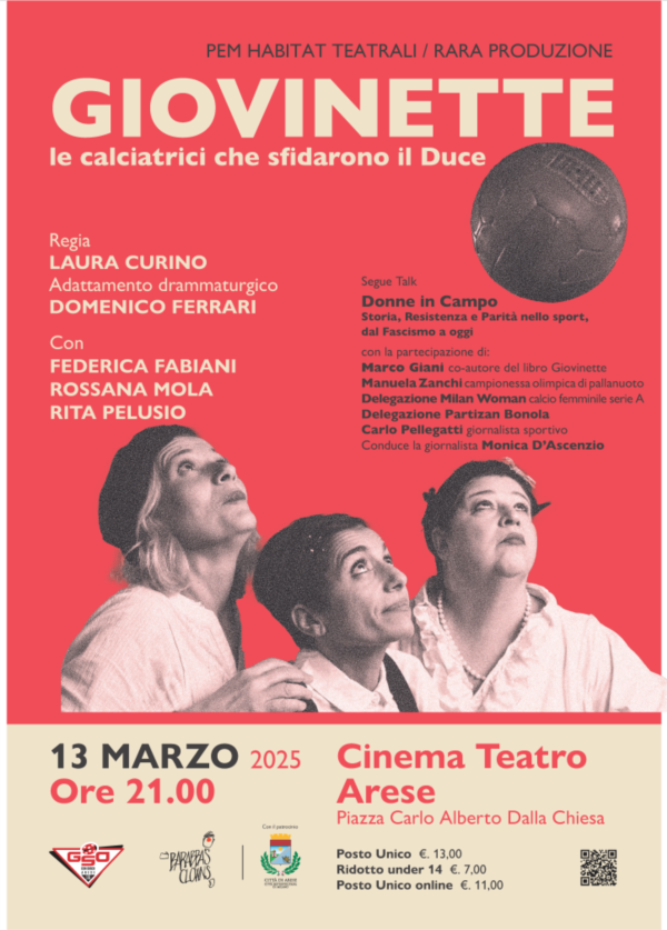 Giovedì 13 marzo alle 21, al Cinema Teatro Arese, andrà in scena lo spettacolo “Giovinette, le calciatrici che sfidarono il Duce” di Laura Curino, con Federica Fabiani, Rossana Mola e Rita Pelusio. Uno spettacolo per tutti, in particolare gli sportivi realizzato in collaborazione con GSO don Bosco – Arese.