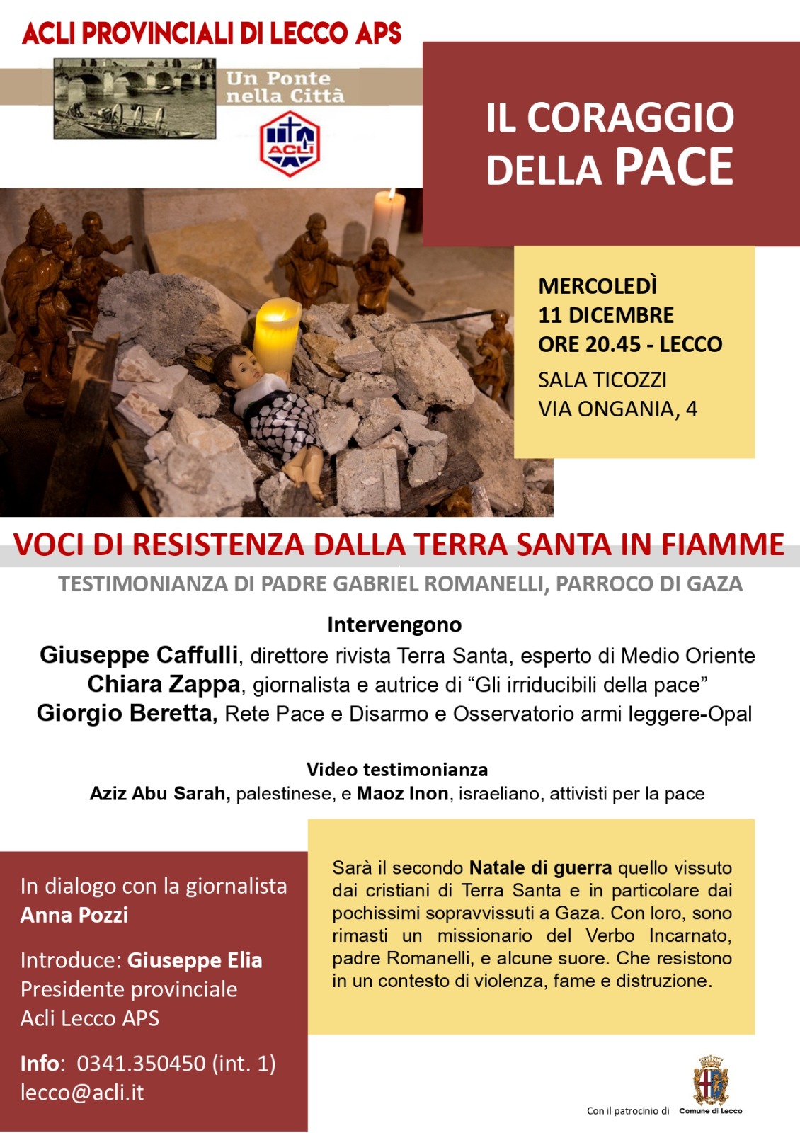 A conclusione del percorso congressuale del 2024, che ha visto impegnata l’associazione sul tema “Il coraggio della Pace”, le Acli propongono un incontro con testimonianze dalla Terra Santa. L’appuntamento è per mercoledì 11 dicembre alle 20.45 in sala Ticozzi a Lecco.