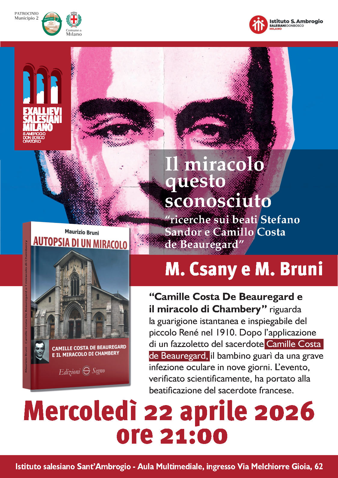 Mercoledì 22 aprile alle 21 presso l’Istituto Salesiano in aula multimediale (ingresso diretto da via Melchiorre Gioia 62 – Milano) l’Unione Exallievi/e di don Bosco di Milano organizza un incontro per presentare il libro «Il miracolo questo sconosciuto» di Maurizio Bruni e Marton Csany.
