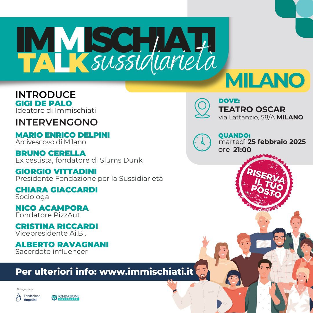 Martedì 25 febbraio alle 21, al Teatro Oscar di Milano, si terrà un talk sulla Sussidiarietà legato al progetto «Immischiati», ideato da Gigi De Palo.