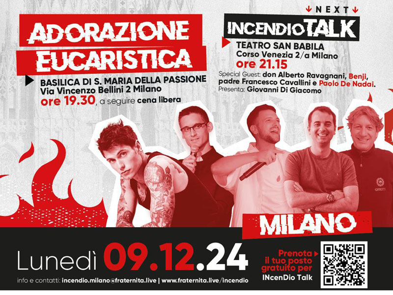 La serata avrà inizio alle ore 19.30 con l’Adorazione eucaristica presso la Basilica di S. Maria della Passione in Milano (via V. Bellini, 2); dopo la cena libera, alle ore 21.15, IncendioTALK presso il Teatro San Babila (corso Venezia, 2/a) con alcuni ospiti d’eccezione: Benji (cantante e musicista del duo Benji & Fede), don Alberto Ravagnani (sacerdote influencer fondatore di LabOratorium), padre Francesco Cavallini (padre gesuita responsabile di diverse attività sociali e culturali) e Paolo De Nadai (fondatore di WeRoad e ScuolaZoo); presenterà Giovanni Di Giacomo.