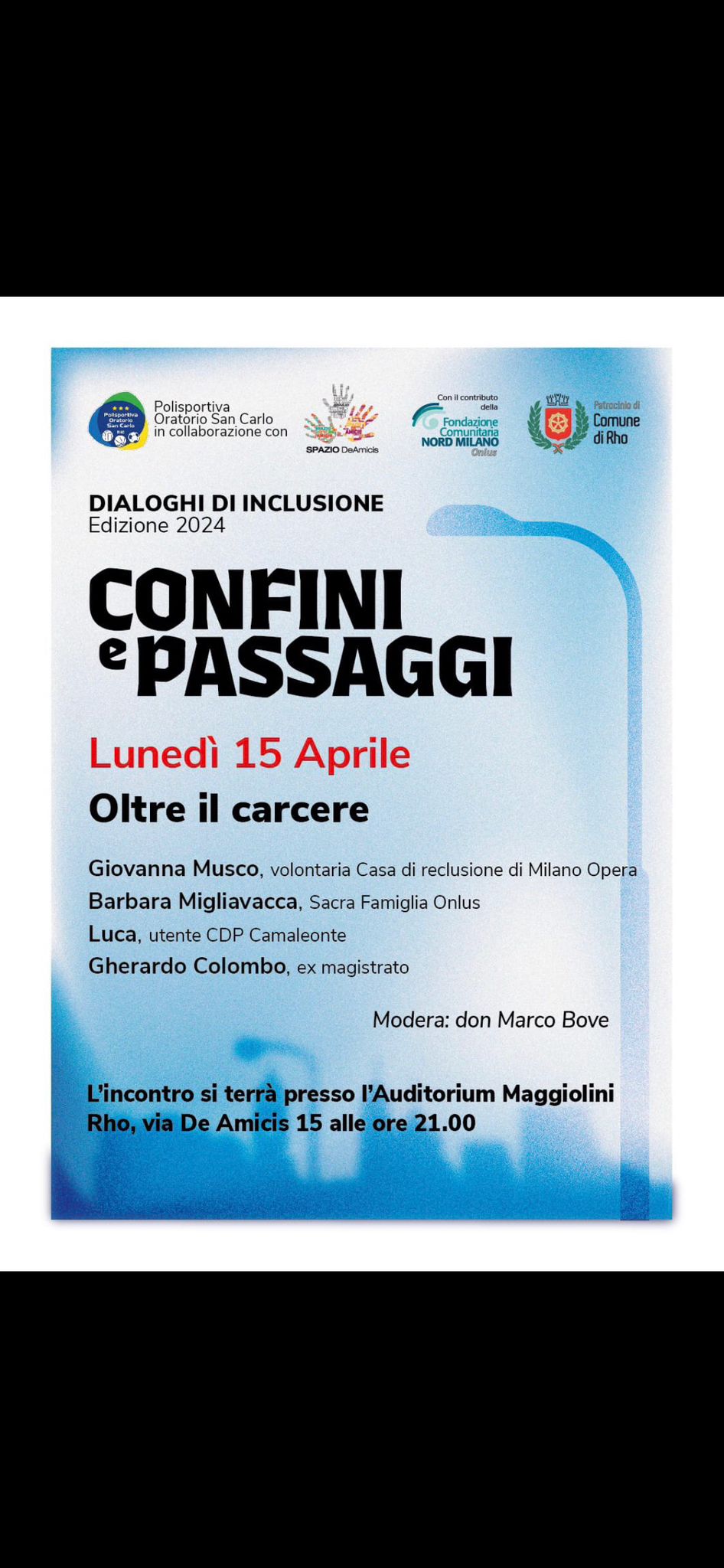 Lunedi 15 aprile, alle 21, presso l’Auditorium Maggiolini di Rho, nell’ambito dei «Dialoghi di inclusione. Confini e passaggi», è in programma «Oltre il carcere», che illustrerà il progetto condotto dalla Fondazione Sacra Famiglia in collaborazione con l’Associazione In Opera, legata alla Sesta Opera: da tre anni un gruppo di pazienti della Fondazione incontra regolarmente alcuni detenuti all’interno del carcere di Opera.