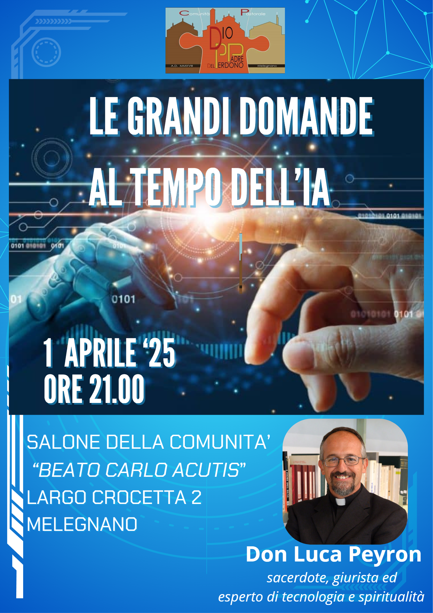 Nel suo pellegrinare per l’Italia e per il mondo nell’adempiere una missione divulgativa, martedì 1 aprile alle 21, presso il Salone della Comunità, don Luca Peyron farà tappa a Melegnano invitato dalla Comunità Pastorale Dio Padre del Perdono per parlare di intelligenza artificiale.