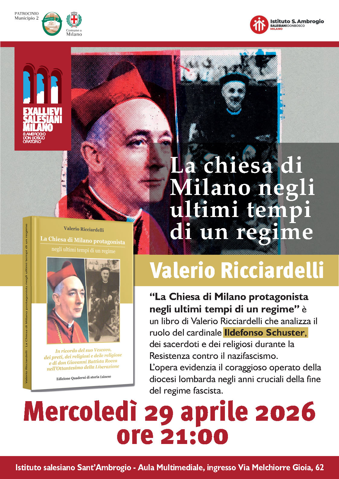 Mercoledì 29 aprile alle 21, presso l’Istituto Salesiano don Bosco di Milano, il gruppo degli Ex Allievi/e organizza la presentazione del libro “La Chiesa di Milano protagonista negli ultimi tempi di un Regime” di Valerio Ricciardelli, autore di svariati libri di storia lombarda ed ex allievo di Vendrogno.
