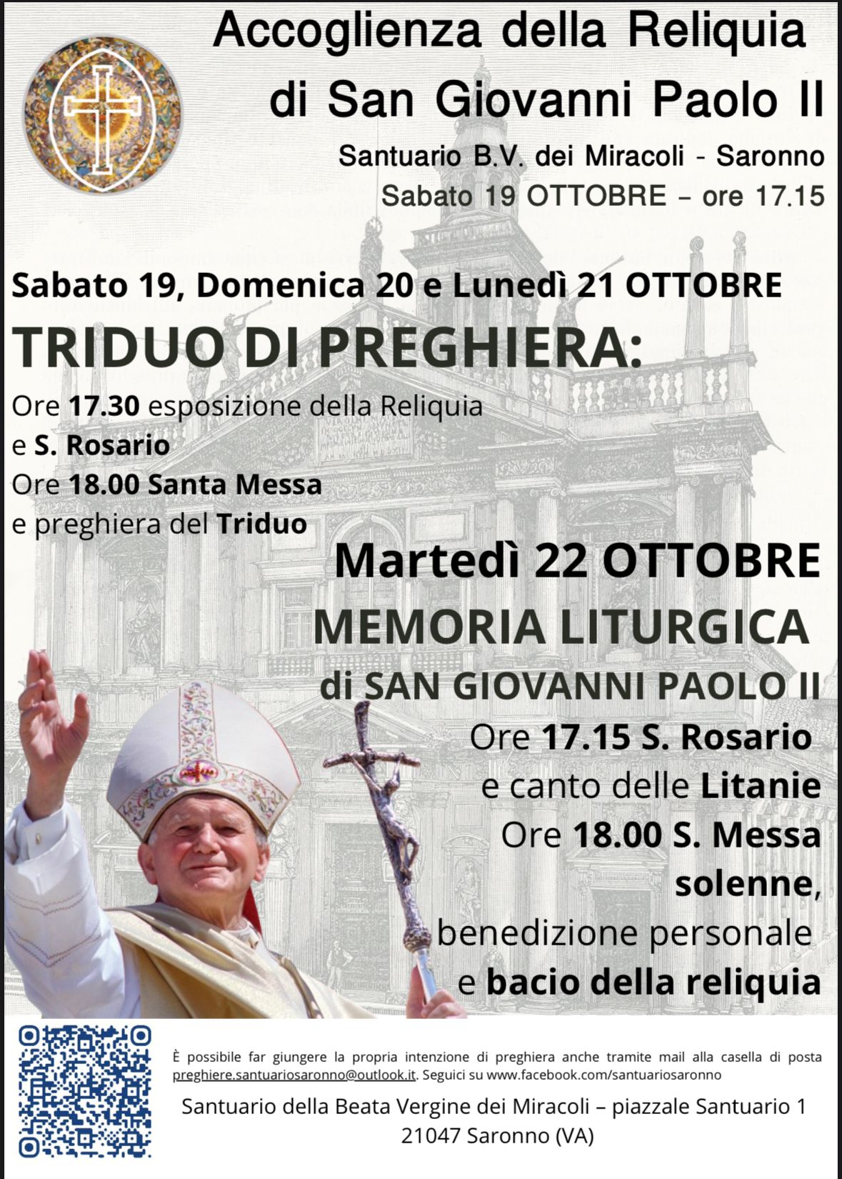 Sabato 19 ottobre alle ore 17.15, il prevosto mons. Marinoni accoglierà la preziosa reliquia, portata da padre Ilario Rudello (nominato Missionario della Misericordia da papa Francesco fin dal Giubileo straordinario), dando così inizio al Triduo di preghiera. Infatti sabato 19, domenica 20 e lunedì 21 ottobre ogni giorno alle ore 17.30 ci sarà l’esposizione solenne della Reliquia ed il S. Rosario; alle ore 18.00 la Santa Messa e la preghiera del Triduo riprendendo ogni volta uno dei temi che papa Wojtyła aveva indicato alla Chiesa nei tre anni di preparazione al Grande Giubileo (Gesù, lo Spirito Santo ed il Padre).