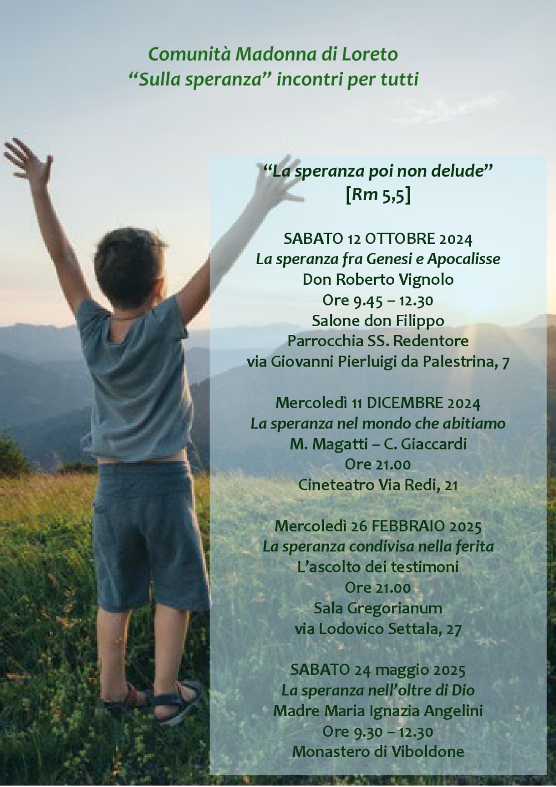 In questo momento in cui abbiamo particolarmente bisogno di “Speranza”, la Comunità Pastorale Madonna di Loreto di Milano ha pensato di organizzare quattro incontri, con a tema “La Speranza poi non delude”.