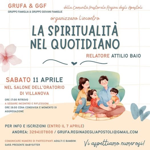 L’appuntamento è organizzato congiuntamente da Comunità Pastorale Regina degli Apostoli e Gruppo Famiglia e Gruppo Giovani Famiglie.