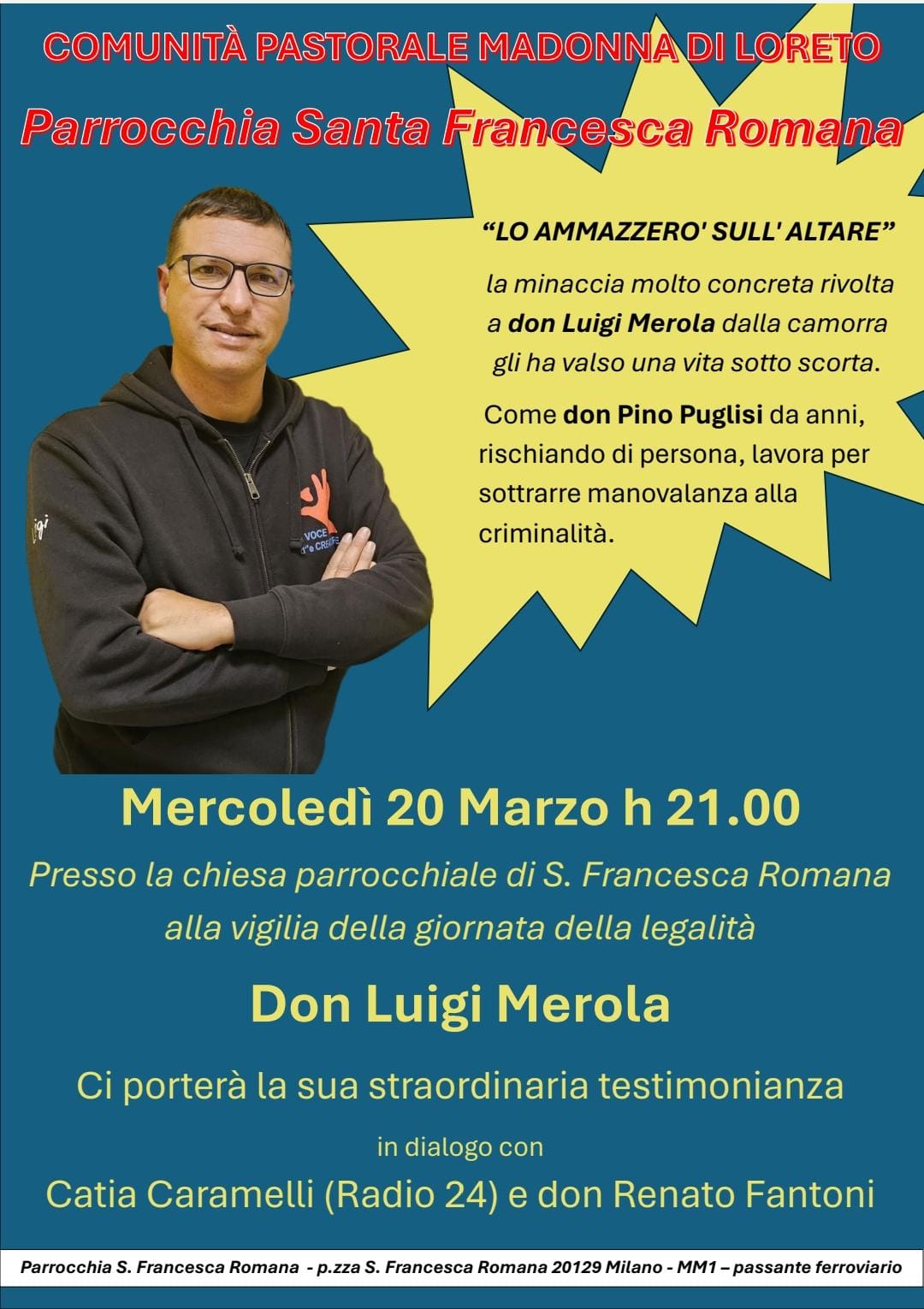 Alla vigilia della giornata della legalità la Comunità pastorale Madonna di Loreto di Milano ospita un testimone straordinario, don Luigi Merola, il sacerdote napoletano da anni sotto scorta per le gravi minacce ricevute dalla criminalità organizzata. In dialogo con Catia Caramelli, radio24, e don Renato Fantoni, don Luigi racconterà il suo straordinario impegno per salvare i bambini dei quartieri più difficili della città.