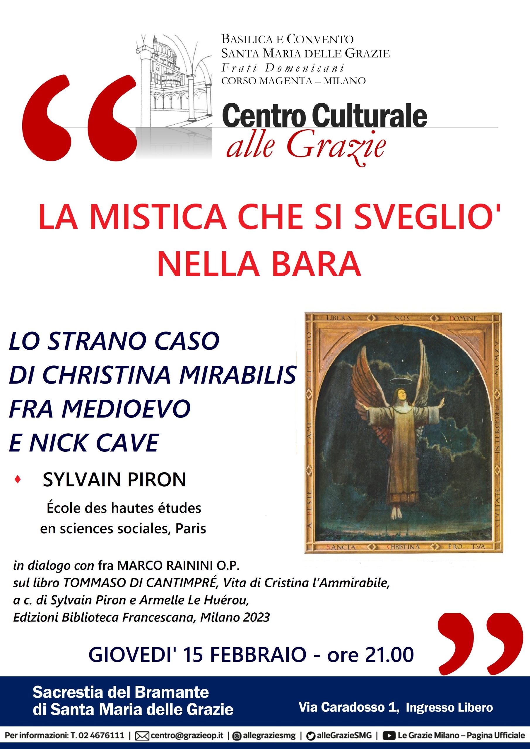 Giovedi 15 febbraio alle 21.00 nella Sacrestia del Bramante Sylvain Piron, direttore dell’École des hautes études en sciences sociales di Parigi presenta la straordinaria figura della mistica belga medievale Cristina l’Ammirabile. Personaggio discusso e oggetto di svariate interpretazioni, dotata di fenomeni mistici e soprannaturali, sospettata in vita di possessione diabolica, famosa per essersi rialzata dalla bara durante il suo funerale celebrato quando era caduta in stato di morte apparente, è stata anche soggetto per una canzone del noto cantautore australiano Nick Cave.
