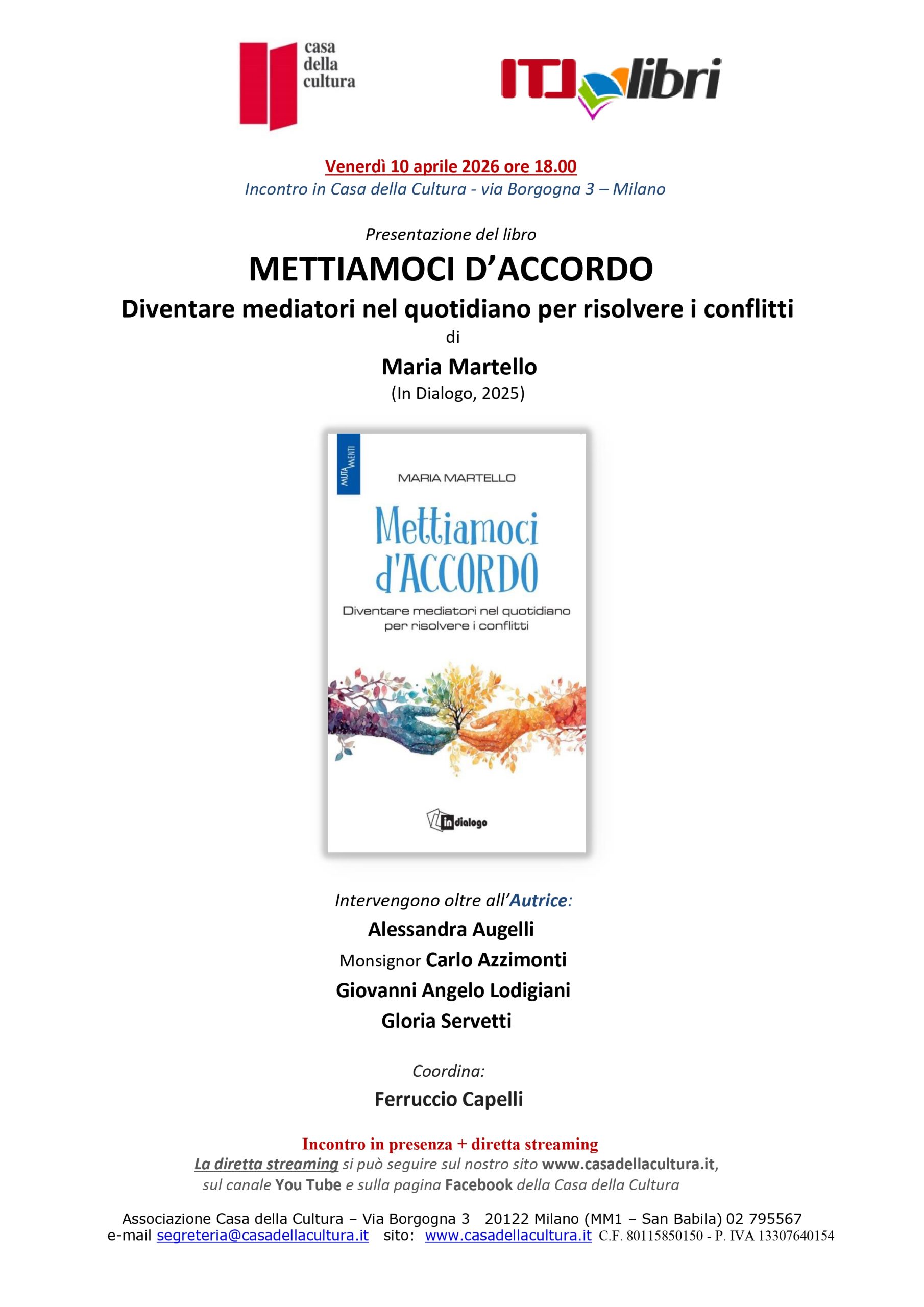 Venerdì 10 aprile alle 18, presso la Casa della Cultura (via Borgogna 3, 20122 Milano) sarà presentato il libro “Mettiamoci d’accordo” di Maria Martello, pubblicato da ITL Libri con il marchio editoriale In Dialogo. Un libro su come diventare mediatori nel quotidiano e imparare a risolvere i conflitti. Insieme all’autrice intervengono monsignor Carlo Azzimonti, Giovanni Angelo Lodigiani e Gloria Servetti. Modera e coordina Ferruccio Capelli.