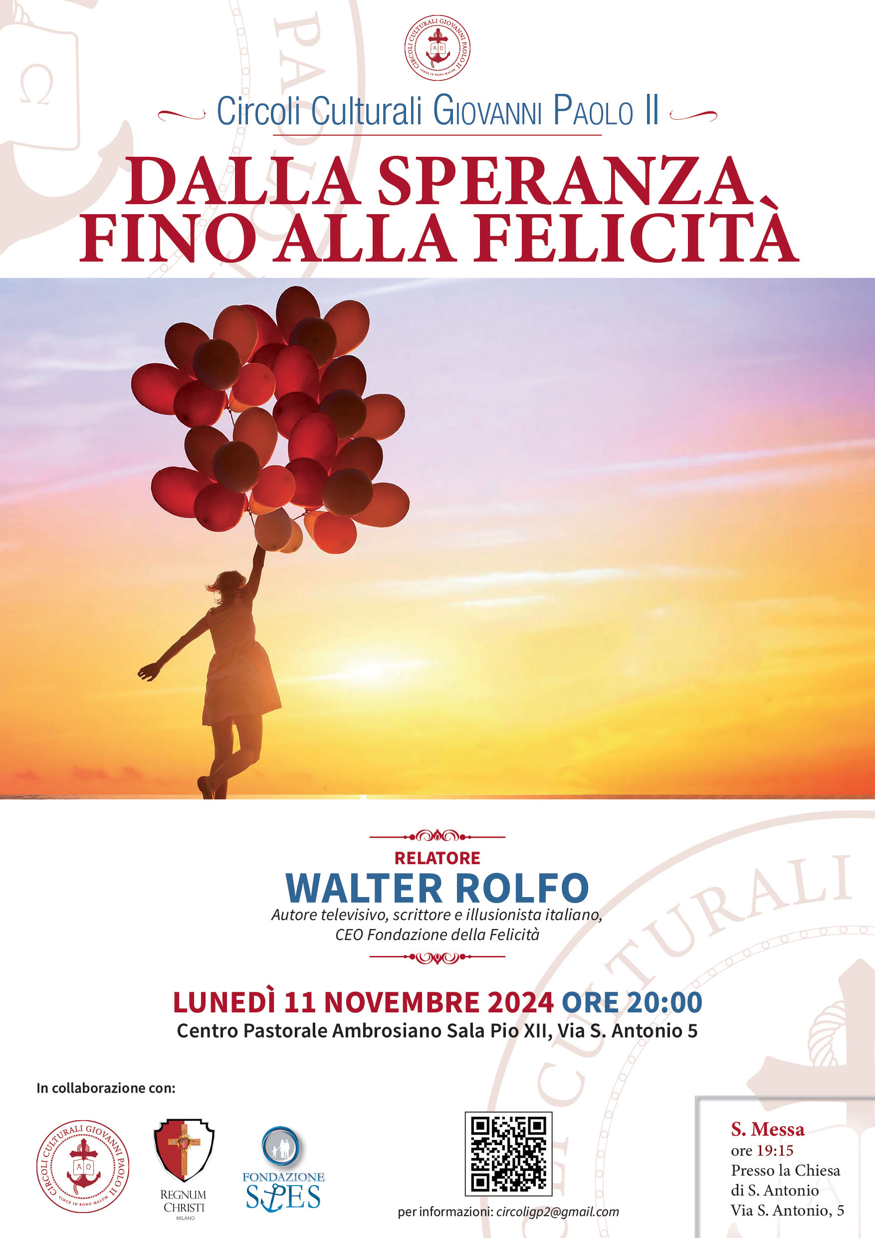 Nel primo appuntamento, al Centro Pastorale Ambrosiano, il prof. Walter Rolfo (docente dell’università di Torino, autore, conduttore e produttore televisivo per RAI, Mediaset e SKY, Fondatore e chairman di Master of Magic e Ceo della Fondazione della Felicità), proporrà una riflessione sul tema “Dalla speranza, fino alla felicità” nella vita contemporanea.