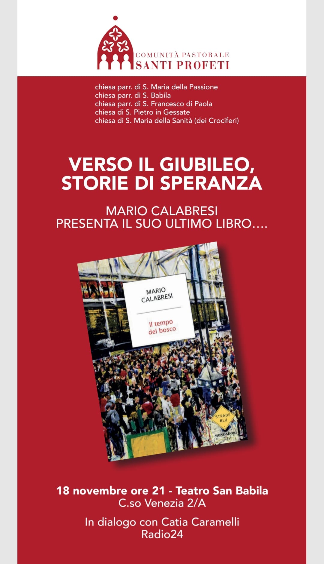 L’autore presenterà il libro, in dialogo con Catia Caramelli (giornalista di Radio24), al Teatro San Babila di Milano il 18 novembre. È una delle iniziative proposte dalla Comunità pastorale Santi Profeti, guidata da don Marco Artoni, per l’Avvento e in vista del Giubileo del 2025 che ha come tema proprio «pellegrini di speranza».