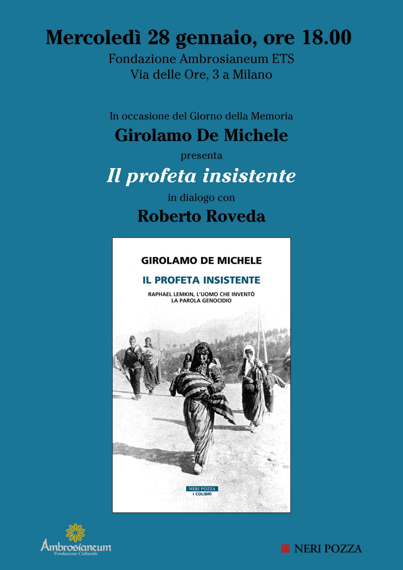 Mercoledì 28 gennaio alle 18 all’Ambrosianeum di Milano, in occasione della Giornata della Memoria, Girolamo de Michele presenterà il suo ultimo libro “Il Profeta insistente” (Neri Pozza editrice) in dialogo con Roberto Roveda. Il “profeta insistente” racconta la vita di Raphael Lemkim, l’uomo che inventò la parola “genocidio”.