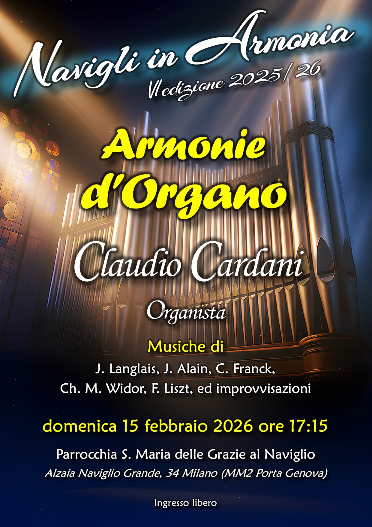 Domenica 15 febbraio alle 17.15 presso la chiesa Santa Maria delle Grazie al Naviglio, si terrà il concerto “Armonie d’organo” a cura del maestro Claudio Cardani, proposto nell’ambito della Rassegna musicale “Navigli in armonia”.