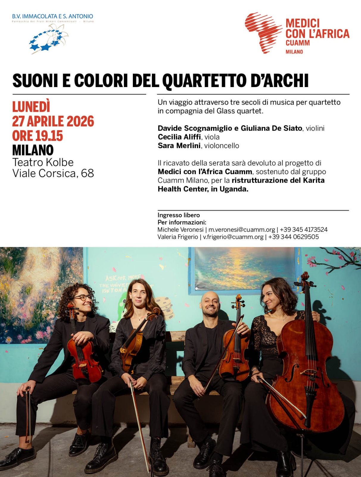 Lunedì 27 aprile alle 19.15, il Teatro Kolbe di viale Corsica in Milano ospiterà un evento musicale con il Glass Quartet, un quartetto d’archi composto da giovani musicisti che hanno scelto di dedicare il loro concerto a Medici con l’Africa. Un gesto che racchiude vicinanza e condivisione all’operato del Cuamm.