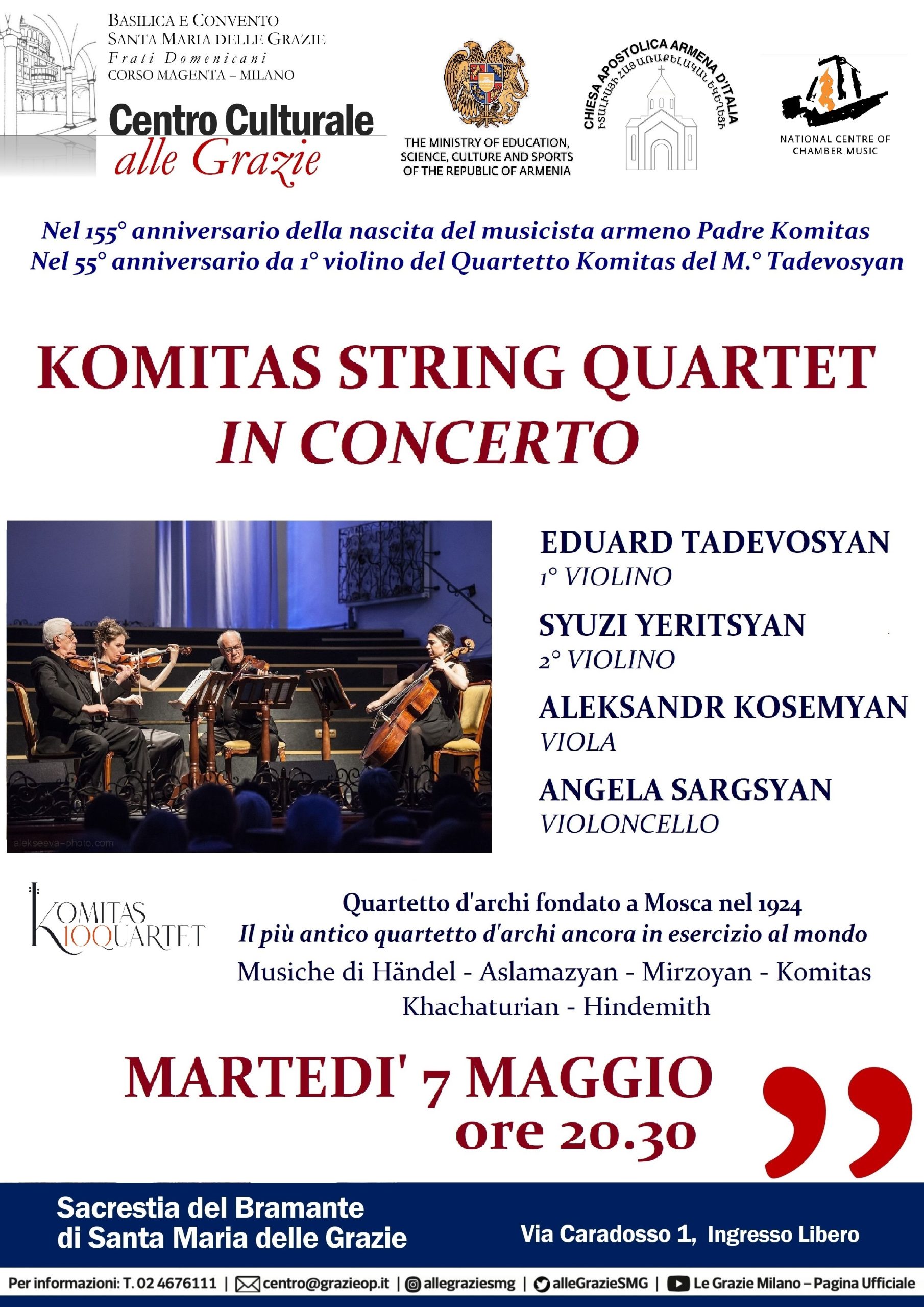 Martedì 7 maggio alle ore 20.30 si terrà presso la Sacrestia del Bramante, via Caradosso 1, un concerto del Komitas String Quartet, formazione musicale armena, fondata nel 1924 a Mosca. L’evento è organizzato dal Centro Culturale alle Grazie (Frati Domenicani), dalla Chiesa Apostolica Armena d’Italia e dal National Centre of Chamber Musica di Yerevan (Armenia), all’interno del progetto di celebrazioni per il centenario del Quartetto che prevede un tour di concerti nei luoghi della diaspora armena, sviluppato anche con l’appoggio del Ministero dell’Educazione, delle Scienze, della Cultura e dello Sport della Repubblica d’Armenia.
