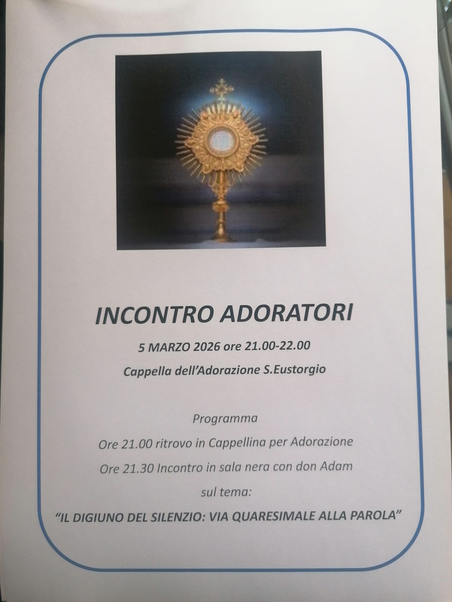 Giovedì 5 marzo dalle 21 alle 22, presso la Cappellina per l’Adorazione della chiesa di Sant’Eustorgio a Milano (in piazza Sant’Eustorgio, 1) si terrà un incontro per Adoratori con don Adam Kieltyk sul tema “Il digiuno del silenzio: via Quaresimale alla Parola”.
