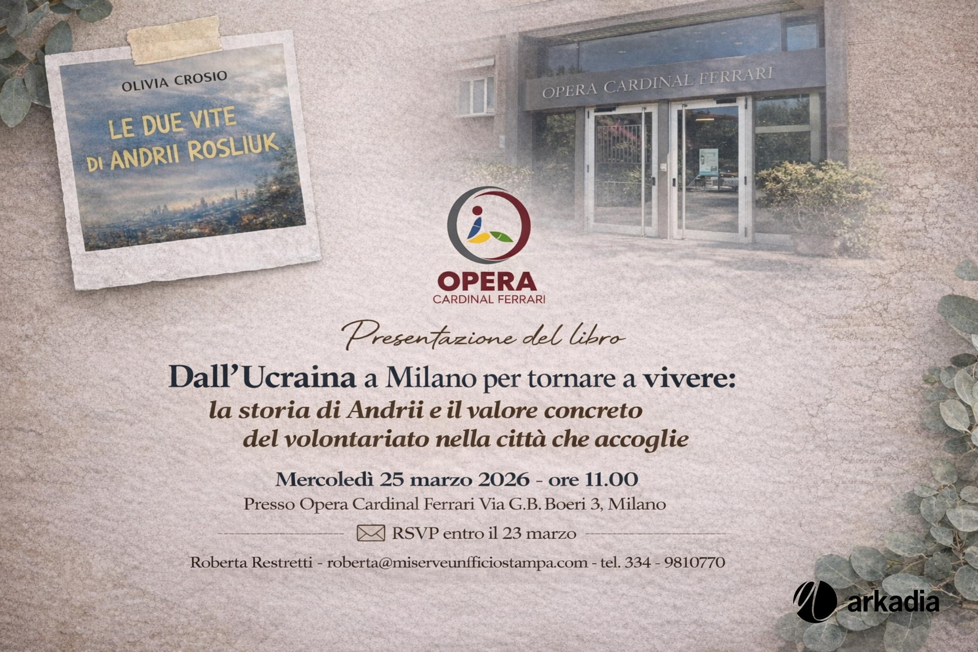 Mercoledì 25 marzo alle ore 11, presso Opera Cardinal Ferrari, sarà presentato il libro “Le due vite di Andrii Rosliuk” di Olivia Crosio (Arkadia Editore), racconto intenso e necessario della vicenda di Andrii, giovane ucraino arrivato a Milano per curarsi da una grave forma di leucemia, insieme alla madre Nataliia, fuggita dalla guerra per salvargli la vita.