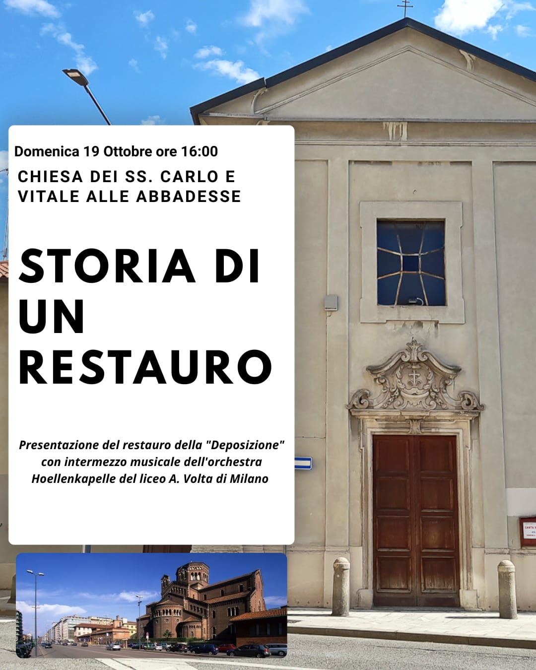 Domenica 19 ottobre alle 16, presso la chiesa dei SS. Carlo e Vitale alle Abbadesse a Milano, sarà presentato il restauro della “Deposizione” con un intermezzo musicale dell’Orchestra Hoellenkapelle del Liceo Volta di Milano.