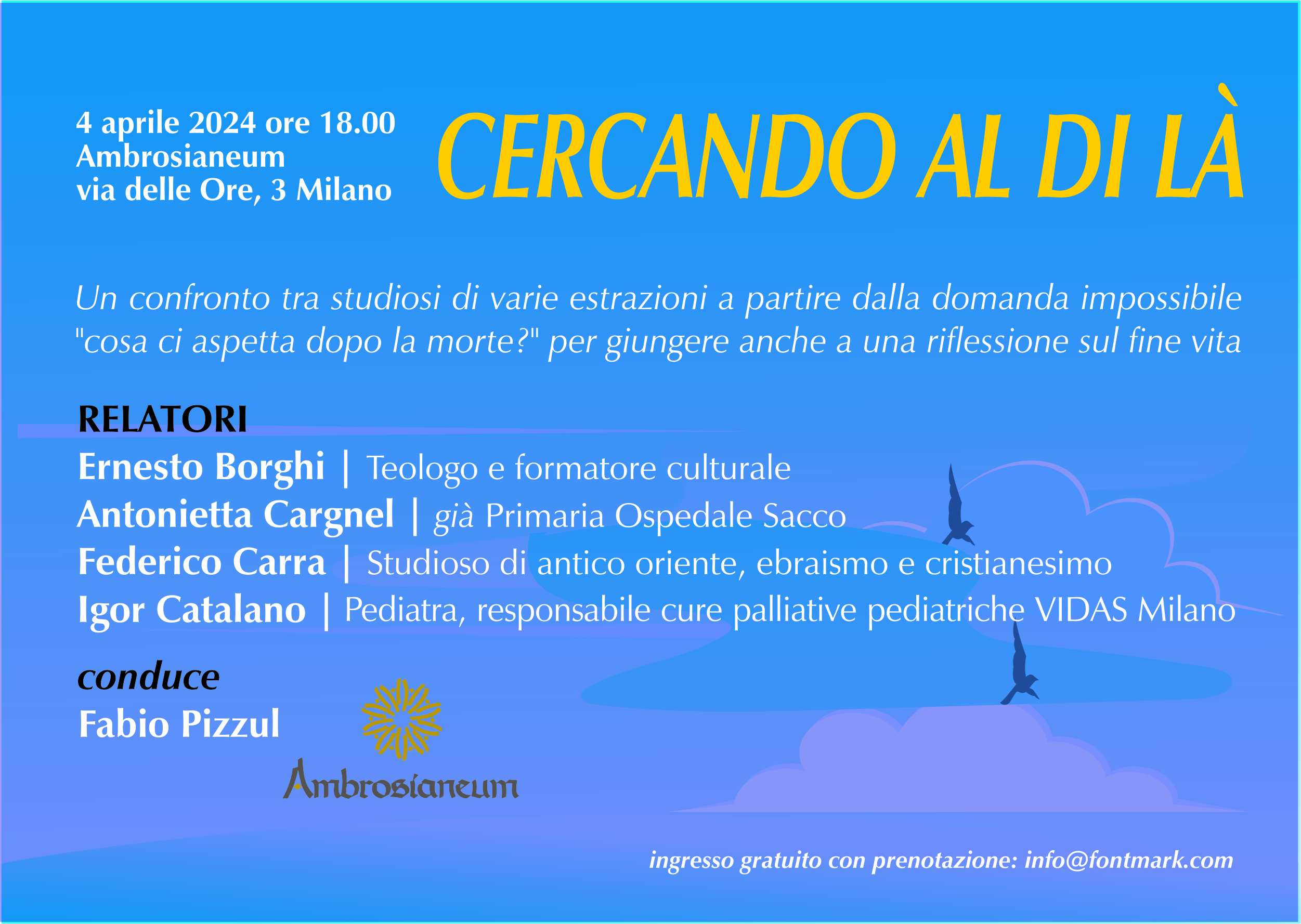 Giovedì 4 aprile alle 18.00 all’Ambrosianeum, appuntamento con “Cercando al di là”, un confronto tra studiosi di varie estrazioni a partire dalla domanda “cosa ci aspetta dopo la morte?” con Ernesto Borghi, Antonietta Cargnel, Federico Carra, Igor Catalano e Fabio Pizzul.
