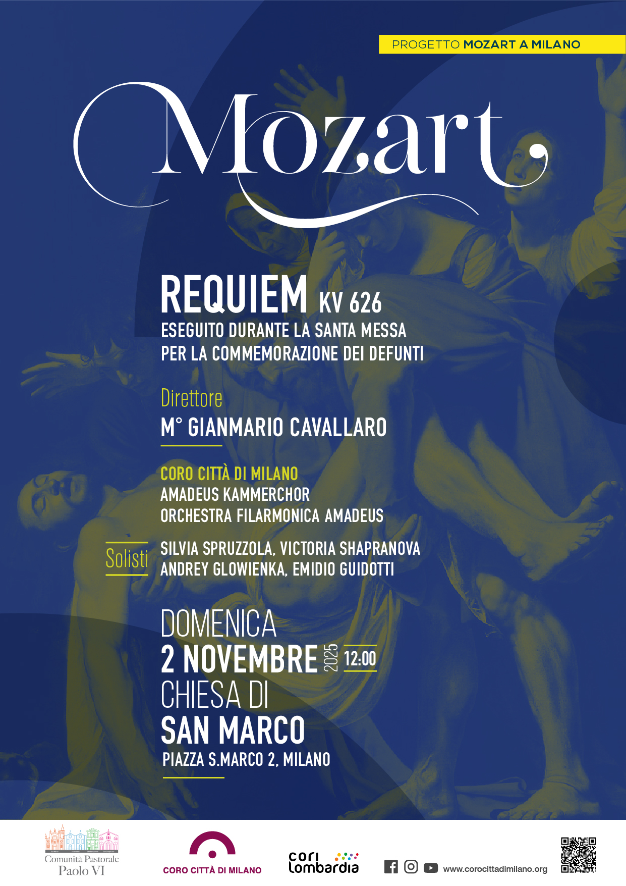 L’esecuzione dei brani dal Requiem KV 626 nella chiesa San Marco per la Messa dei Defunti del 2 novembre 2025 costituisce la quarta tappa del progetto “Mozart a Milano” promosso da Coro Città di Milano, una rassegna di concerti gratuiti dedicati ai milanesi e ispirati ai luoghi mozartiani della città dove il giovane Mozart soggiornò e si esibì tra il 1769 e il 1773.