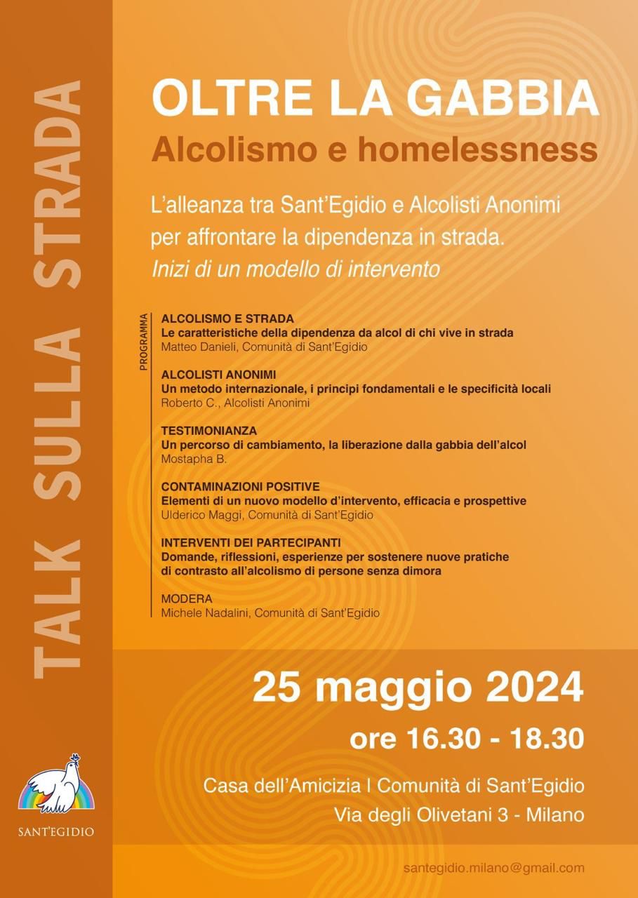 Sabato 25 maggio alle 16.30 presso la Casa dell’Amicizia in via degli Olivetani 3 a Milano, si terrà un nuovo talk sulla strada, questa volta dedicato alle prospettive aperte da Alcolisti Anonimi e Sant’Egidio a Milano per contrastare una delle dipendenze più diffuse tra chi vive senza dimora.