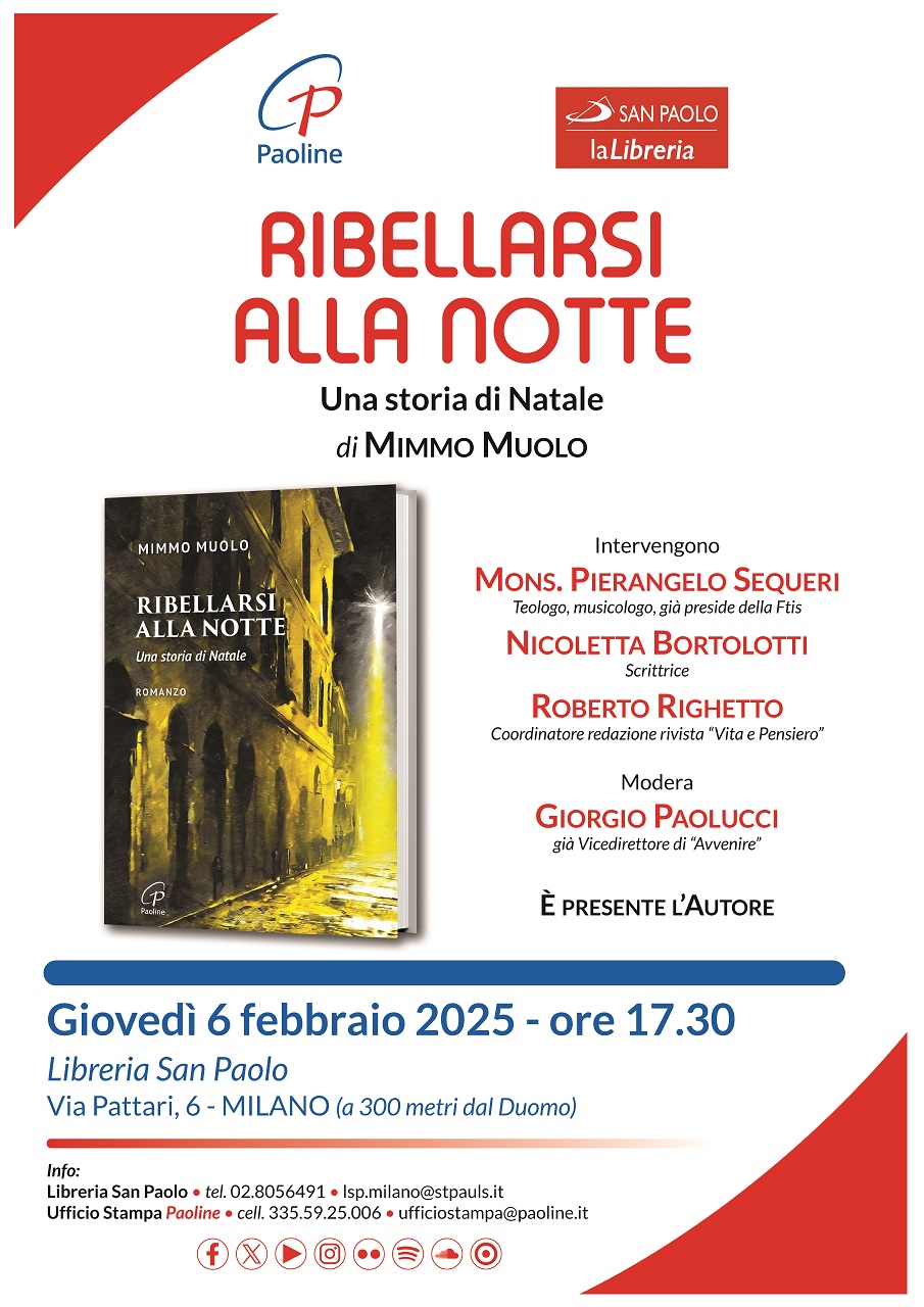 Ribellarsi alla notte (Paoline, 216 pagine, 16 euro), avvincente «giallo religioso» scritto da Mimmo Muolo, vaticanista di Avvenire, mette il lettore di fronte a una domanda che va ben oltre il fatto di cronaca: cosa succede nella vita di ognuno di noi quando il Dio fatto uomo scompare dall’orizzonte?
