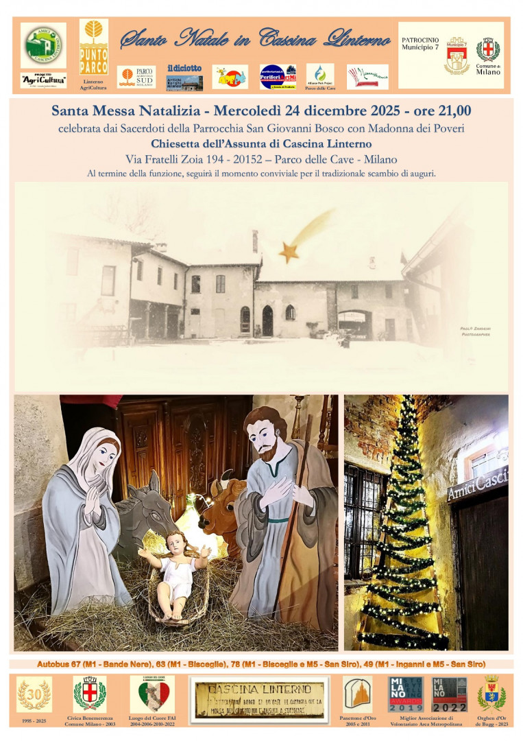 Mercoledì 24 dicembre alle 21, nella chiesetta dell’Assunta di Cascina Linterno, sarà celebrata la Santa Messa Natalizia dai Sacerdoti della parrocchia San Giovanni Bosco con Madonna dei Poveri. Al termine della funzione, seguirà il momento conviviale per il tradizionale scambio di auguri.