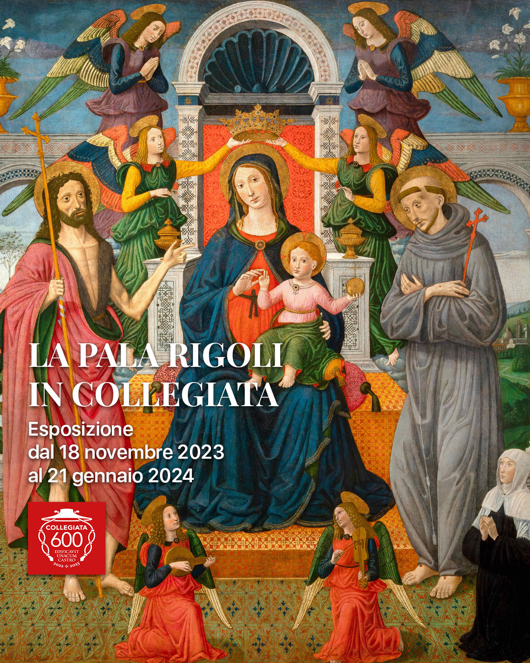 Fino al 21 gennaio la Collegiata ospita la Pala Rigoli, la più grande opera nota di Alesso di Benozzo (Pisa 1473 – Firenze 1528), proveniente da una collezione privata. Meno celebre rispetto al padre Benozzo Gozzoli, dal quale ereditò la fiorente bottega, Alesso mostra il suo valore nelle linee nitide di contorno, i colori vivaci, la ricchezza delle decorazioni, il gusto per la simmetria, la bellezza di scorci paesaggistici, la prospettiva del pavimento in maiolica con le piastrelle decorate a una a una. Accattivanti gli angeli dalle ali multicolori che adorano la Madonna con il Bambino tra i santi Giovanni Battista e Francesco d’Assisi, la incoronano e suonano celesti melodie.