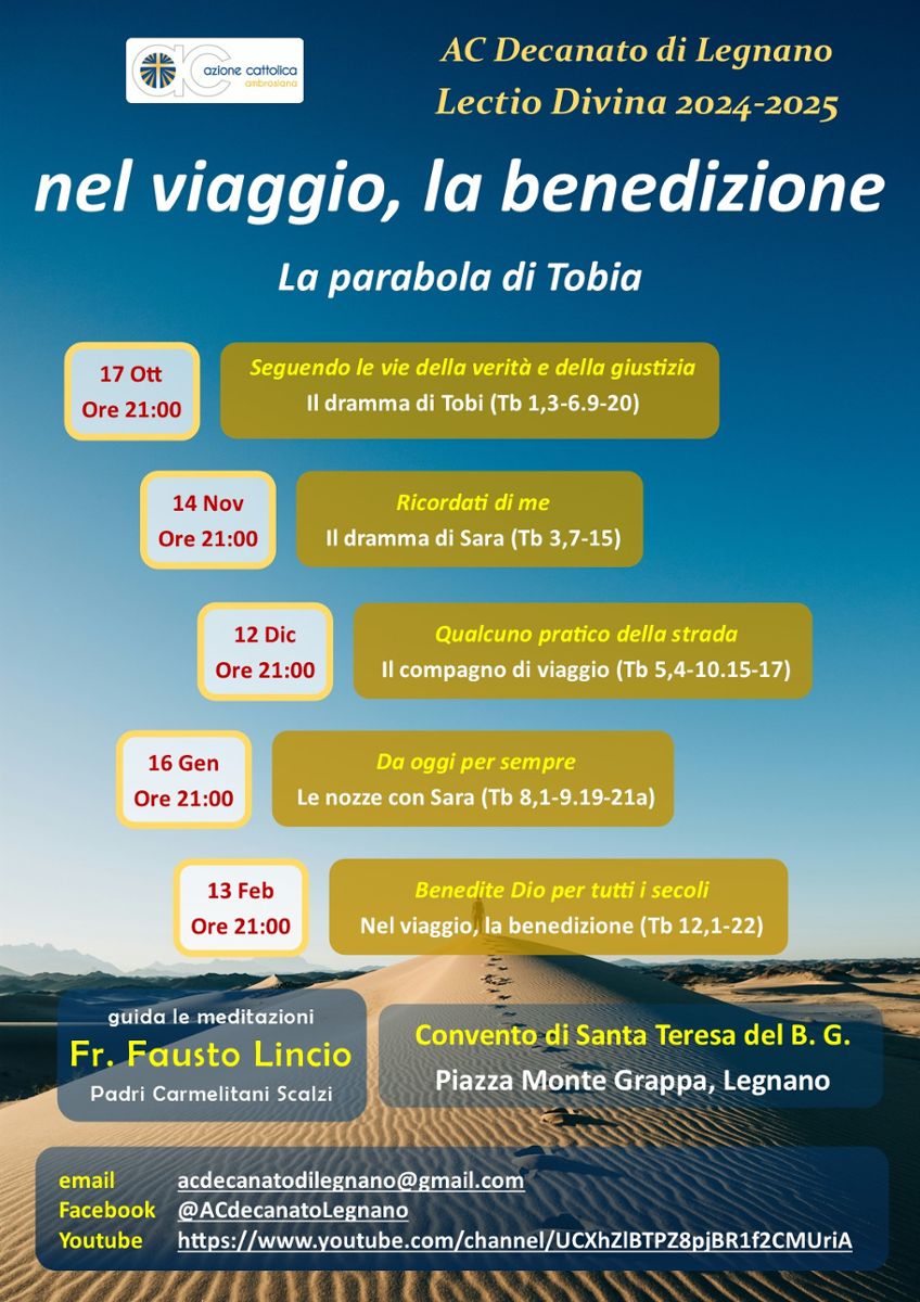 La parabola di Tobia sarà al centro di un ciclo di incontri di Lectio divina organizzato dal grupo di Azione cattolica del Decanato di Legnano a partire da giovedì 17 ottobre. Tutti gli incontri saranno condotti dal responsabile dei Padri Carmelitani Scalzi fra Fausto Lincio e si svolgeranno nel convento di Santa Teresa del Bambin Gesù di Legnano con inizio alle 21.