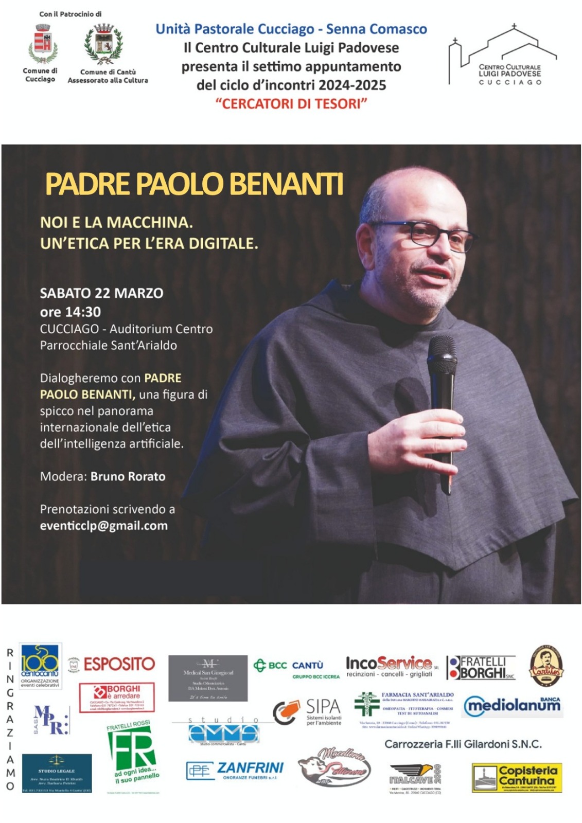 Sabato 22 marzo alle 14.30 a Cucciago, Padre Paolo Benanti sarà ospite della parrocchia per parlare di intelligenza artificiale, nell’ambito del ciclo “Cercatori di tesori”. Modera Bruno Rorato.