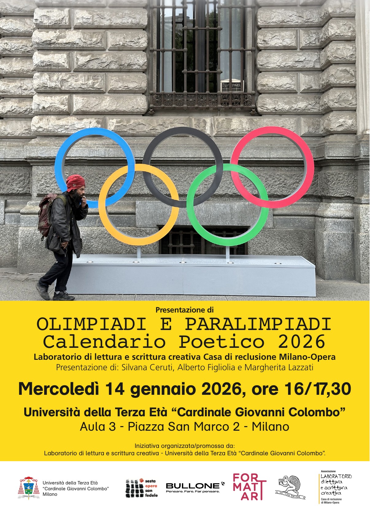 Mercoledì 14 gennaio alle 16, presso l’Università della Terza Età Cardinal Colombo di Milano, sarà presentato il “Calendario Poetico 2026: Olimpiadi e Paralimpiadi oltre gli ostacoli” a cura del Laboratorio di lettura e scrittura creativa del carcere di Milano-Opera. Un’opera, con la prefazione di Darwin Pastorin, realizzata in occasione delle Olimpiadi Invernali Milano Cortina 2026, che non intende celebrare i campioni, ma raccogliere poesie scritte dalle persone detenute presso il carcere di Milano-Opera che interpretano lo sport come metafora di libertà e resistenza, guardando all’evento dalle loro prospettive uniche.