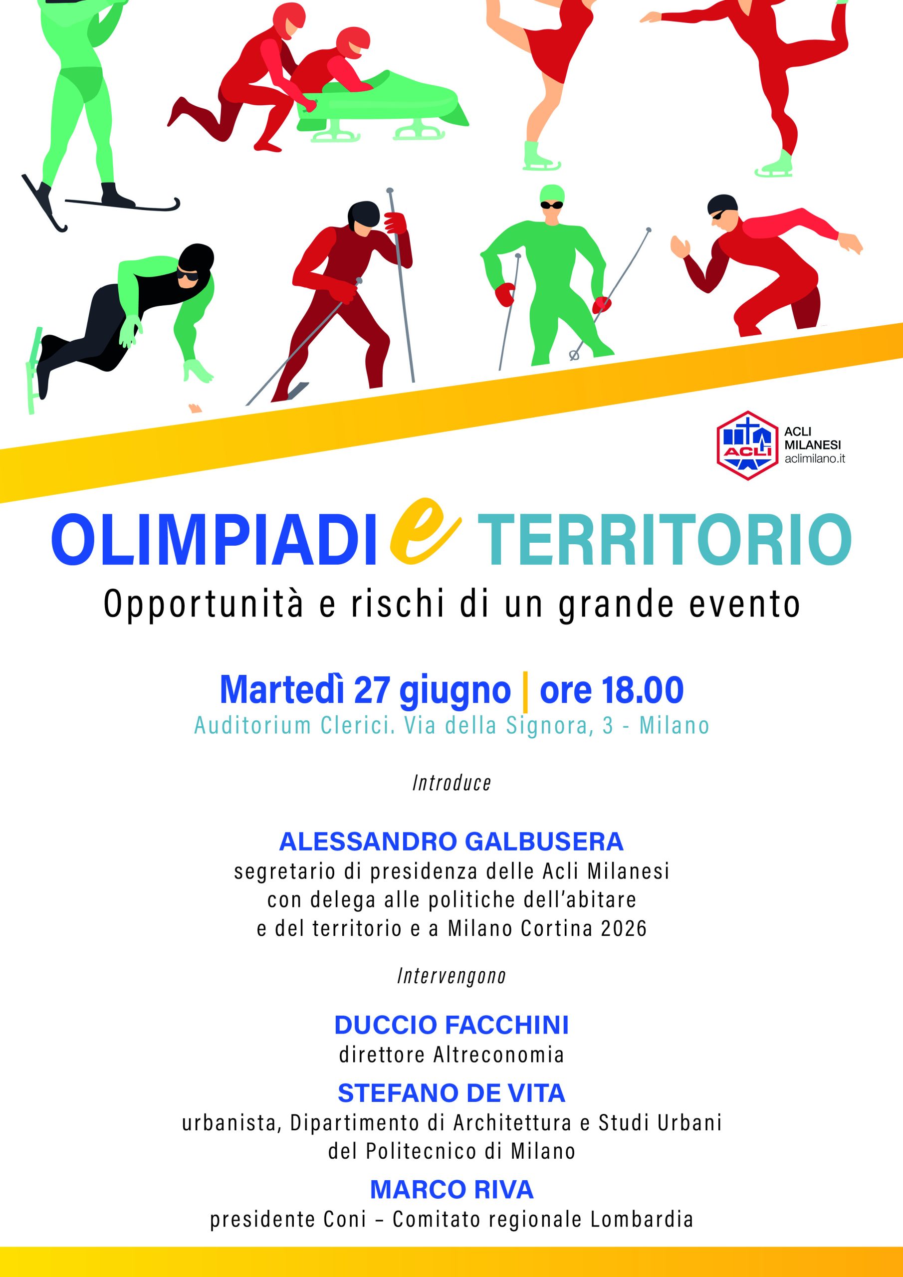 Si parlerà delle prossime olimpiadi invernali nel seminario, organizzato dalle Acli Milanesi, martedì 27 giugno alle 18 presso la sede provinciale di via della Signora 3 a Milano.