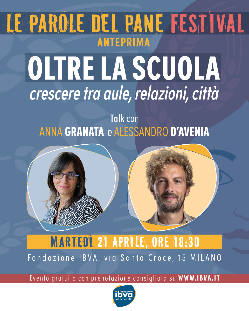 Martedì 21 aprile, alle 18.30, in via Santa Croce 15 a Milano, Fondazione Ibva organizza un talk con Anna Granata (prof.ssa di Pedagogia Generale dell’Università Bicocca) e Alessandro D’Avenia (insegnante, scrittore, sceneggiatore) intitolato “Oltre la scuola. Crescere tra aule, relazioni, città”.