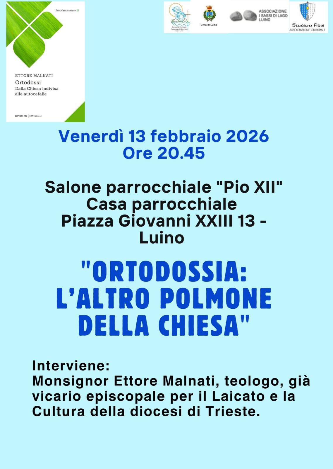 Venerdì 13 febbraio alle 20.45 presso il salone parrocchiale “Pio XII” (piano rialzato – casa parrocchiale) in piazza Giovanni XXIII 13 a Luino (Va) si terrà un’interessante conferenza sul tema “L’ortodossia: l’altro polmone della Chiesa”.