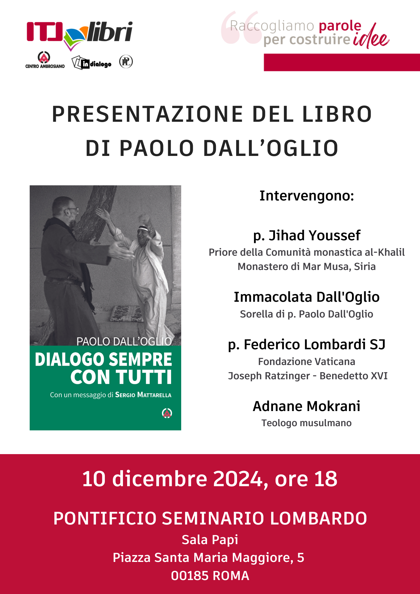 Interverrà  padre Jihad Youssef (erede spirituale di padre Dall’Oglio e attuale guida della Comunità monastica al-Khalil di Deir Mar Musa in Siria), Immacolata Dall’Oglio (sorella di padre Paolo), padre Federico Lombardi (Fondazione Vaticana) e Adnane Mokrani (teologo musulmano).