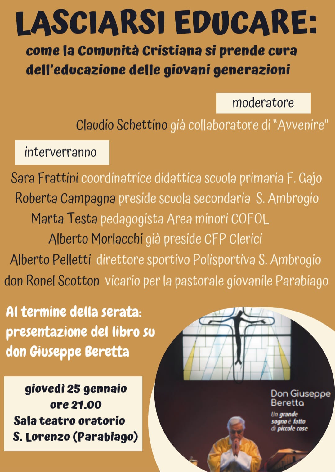 Sempre per ricordare le numerose iniziative intraprese, è stata organizzata una serata per giovedì 25 gennaio presso la sala Teatro dell’Oratorio di San Lorenzo di Parabiago su un tema a lui molto caro, l’educazione dei ragazzi.