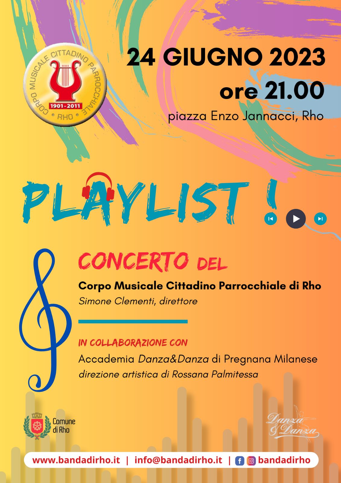 «Playlist!»: è il titolo del concerto del Corpo Musicale Cittadino Parrocchiale di Rho, diretto dal Maestro Simone Clementi, in collaborazione con l’Accademia Danza&Danza di Pregnana Milanese, con la direzione artistica di Rossana Palmitessa (diplomata presso la Scuola di Ballo del Teatro alla Scala di Milano) in programma sabato 24 giugno alle ore 21 in Piazza Jannacci a Rho (guarda la locandina).