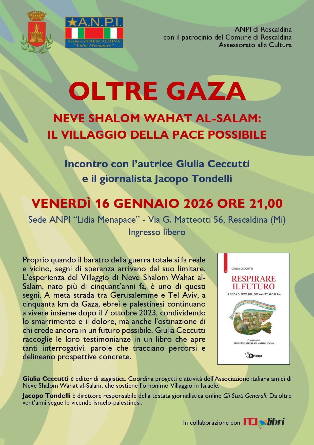 L’ANPI Rescaldina (Associazione Nazionale Partigiani d’Italia, sezione Lidia Menapace) e Itl Libri organizzano per venerdì 16 gennaio alle 21, l’evento «Oltre Gaza. Neve Shalom Wahat Al-Salam. Il villaggio della pace possibile» con Giulia Ceccutti (autrice del libro Respirare il futuro. La sfida di Neve Shalom Wahat al-Salam (In Dialogo, 224 pagine, 18 euro) e il giornalista Jacopo Tondelli, direttore responsabile della testata giornalistica online Gli Stati Generali.